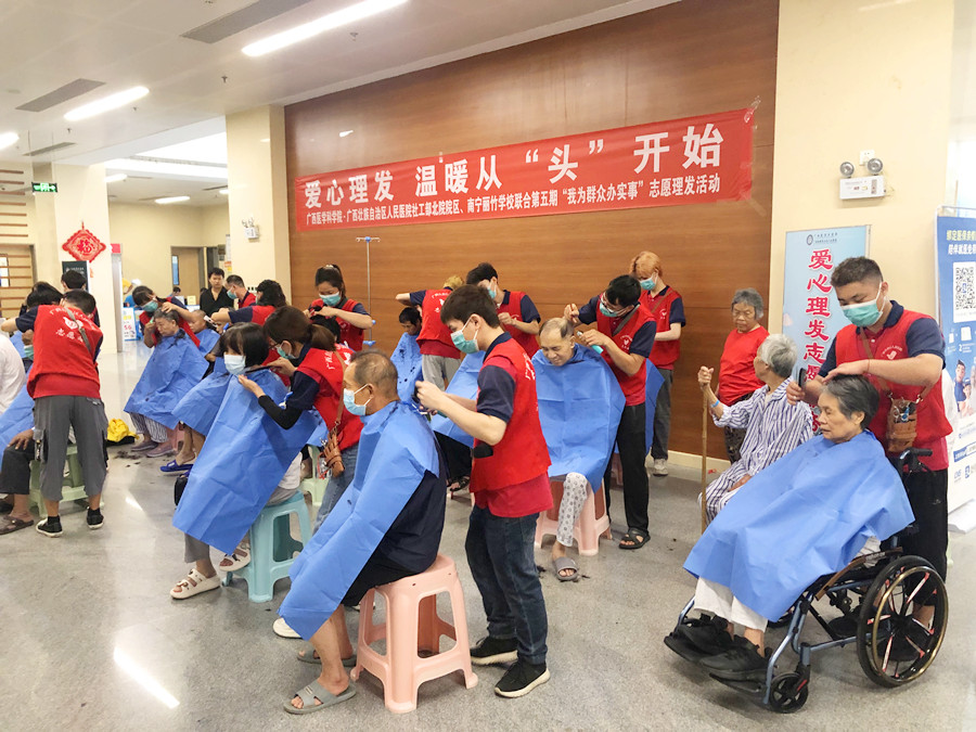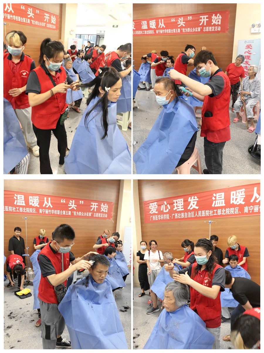 廣西美發(fā)學(xué)校愛心義剪、廣西美發(fā)學(xué)校醫(yī)院公益活動:7月28日,中共麗竹學(xué)校學(xué)校支部志愿者服務(wù)隊(廣西美發(fā)培訓(xùn)班)主動申請參加廣西學(xué)科學(xué)院·廣西壯族自治區(qū)人們醫(yī)院社工部北院院區(qū)共同組織的第五期“我為群眾辦實事”系列---愛心理發(fā),溫暖從“頭”開始為主題的志愿者理發(fā)活動。