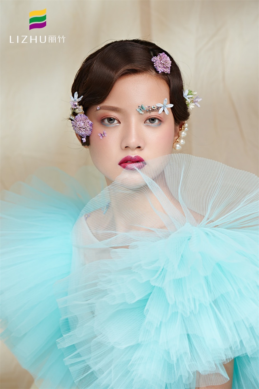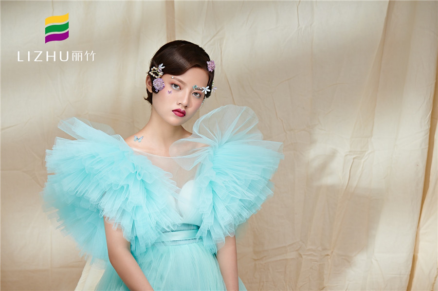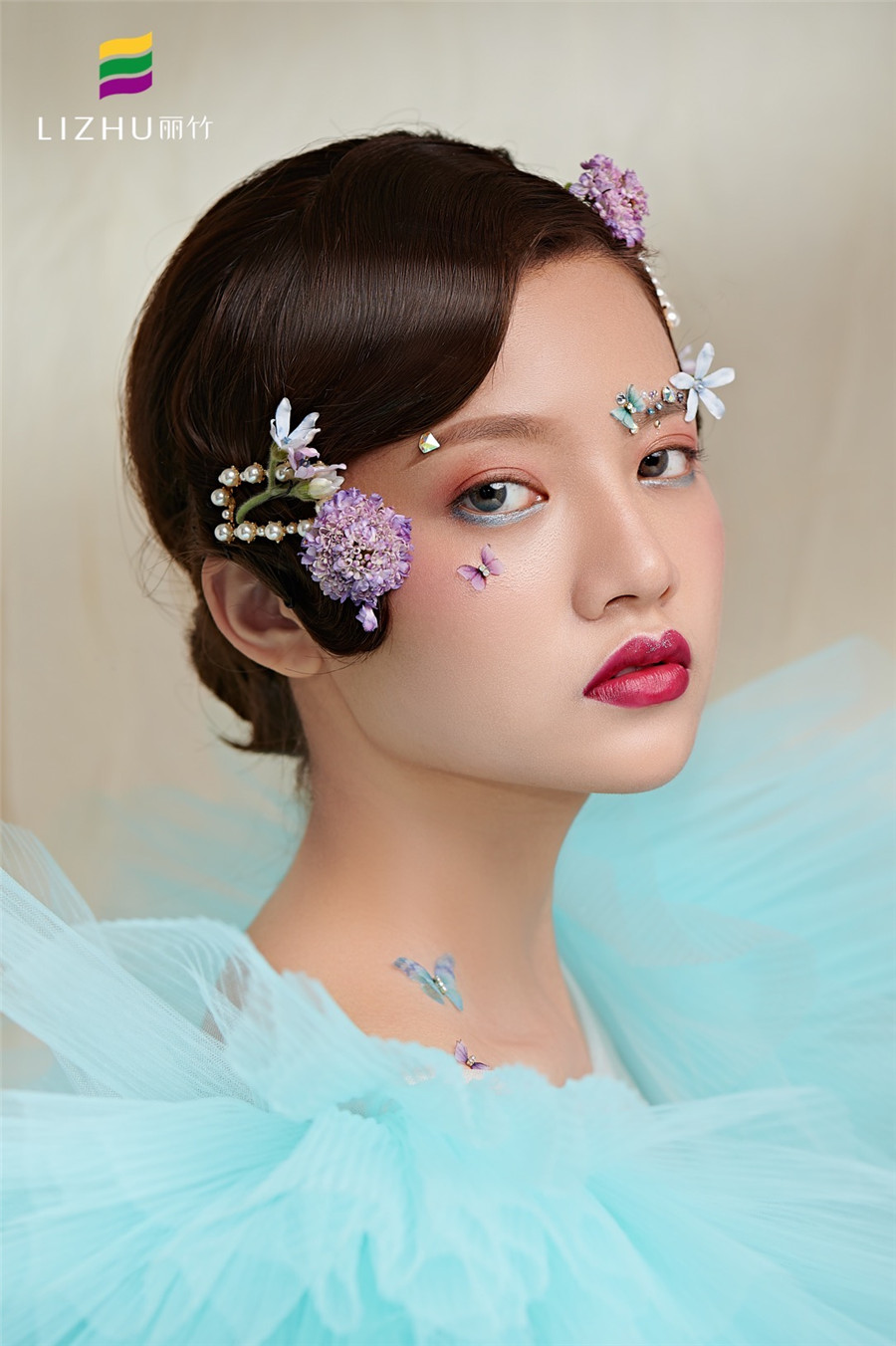 麗竹學校彩妝作品---流光·化蝶 ·夢幻:藍色輕紗加上妝容花朵點綴,頭飾與發(fā)型的完美搭配,流淌出輕柔舒緩之美,簡約自然的情緒態(tài)度。