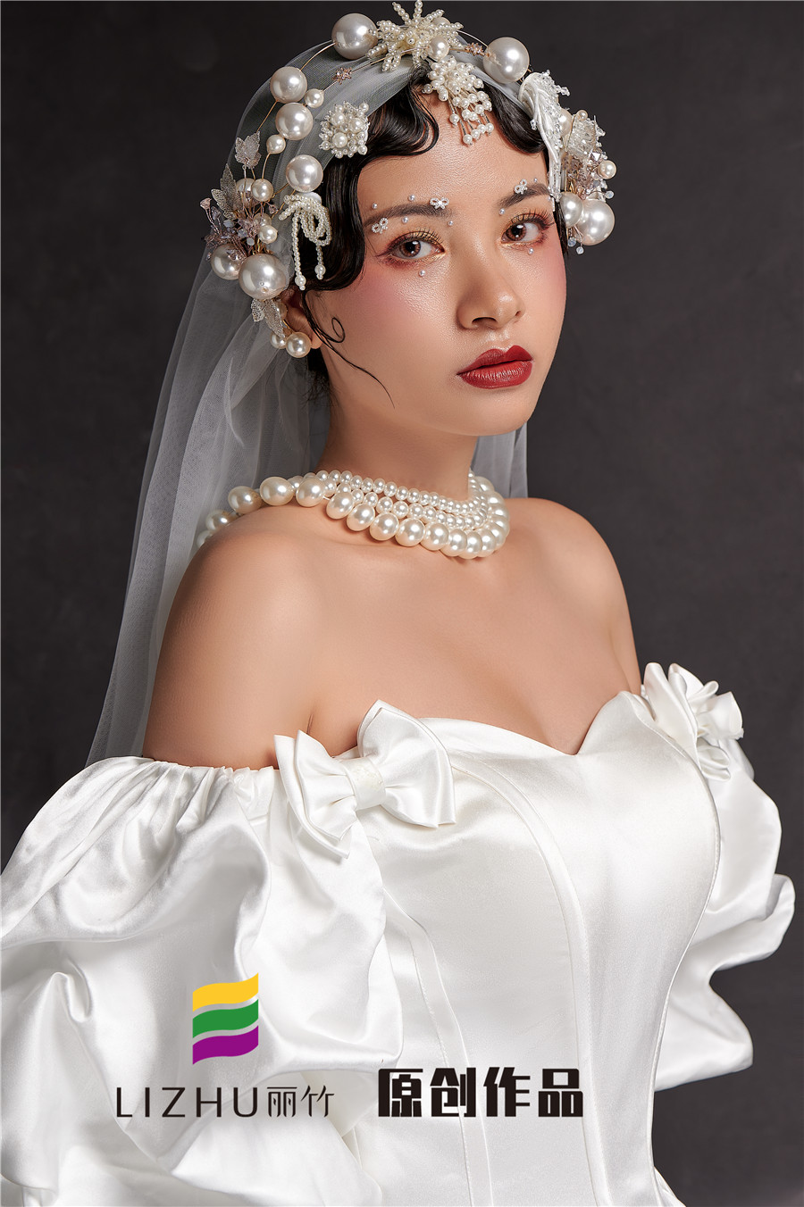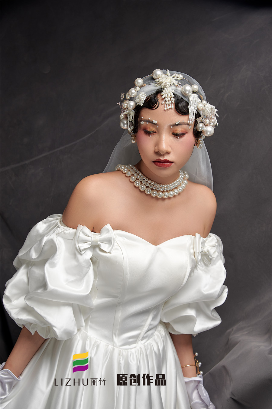 廣西排名前十彩妝學(xué)校分享:麗竹學(xué)校彩妝作品---輕奢復(fù)古造型:潔白充滿設(shè)計(jì)感的禮服,珍珠點(diǎn)綴,星光點(diǎn)點(diǎn)的,是夢(mèng)幻與現(xiàn)實(shí)的交替。