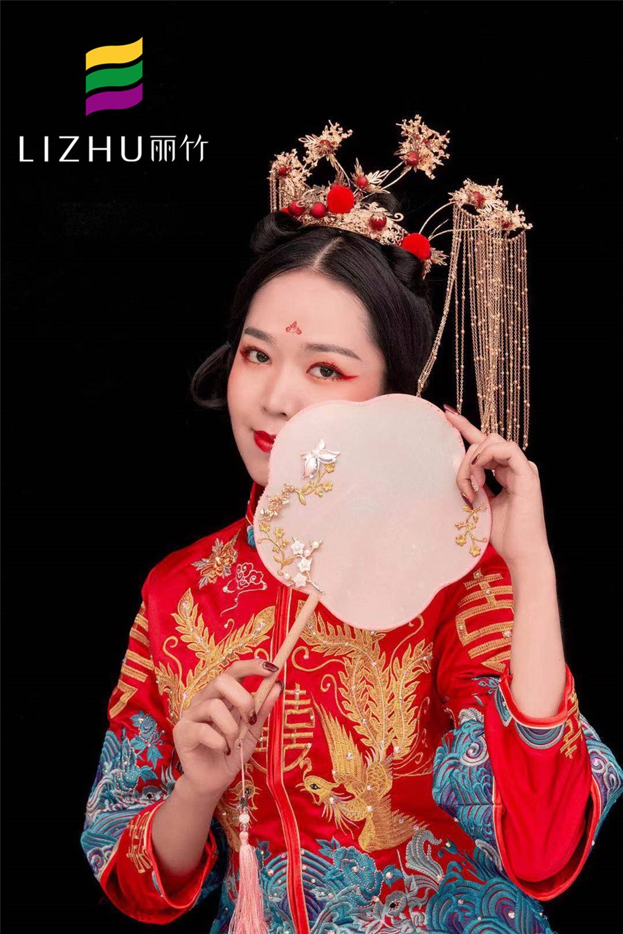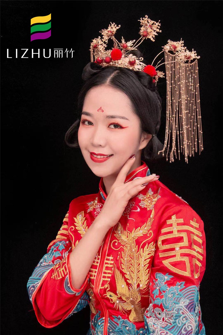 麗竹學(xué)校彩妝作品:中式秀禾新娘造型:端莊喜慶大氣的紅色,配上雍容華貴的金絲秀禾,典雅的妝容更顯新娘儀態(tài)萬千,散發(fā)出濃濃的東方魅力。