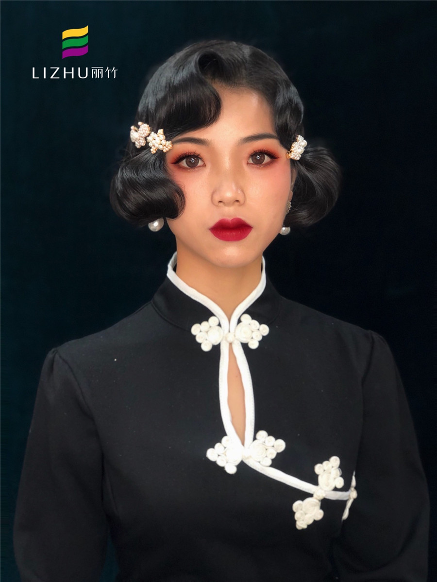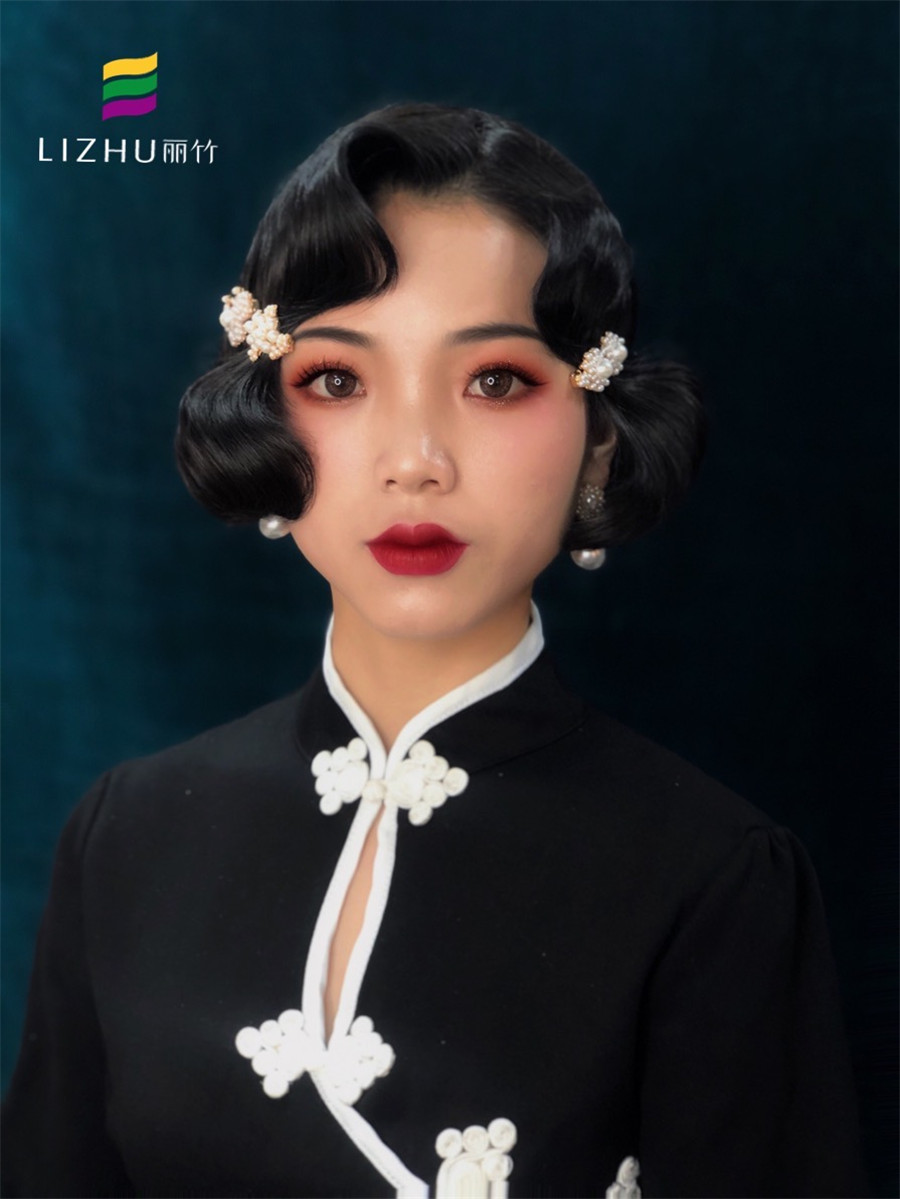 廣西彩妝造型培訓(xùn)學(xué)校作品---旗袍妝容造型:流暢圓潤(rùn)的復(fù)古手推波發(fā)型,涂抹婀娜多姿的烈焰紅唇,身穿黑色改良國(guó)風(fēng)旗袍,還原老上海復(fù)古風(fēng)情,優(yōu)雅復(fù)古韻味十足。