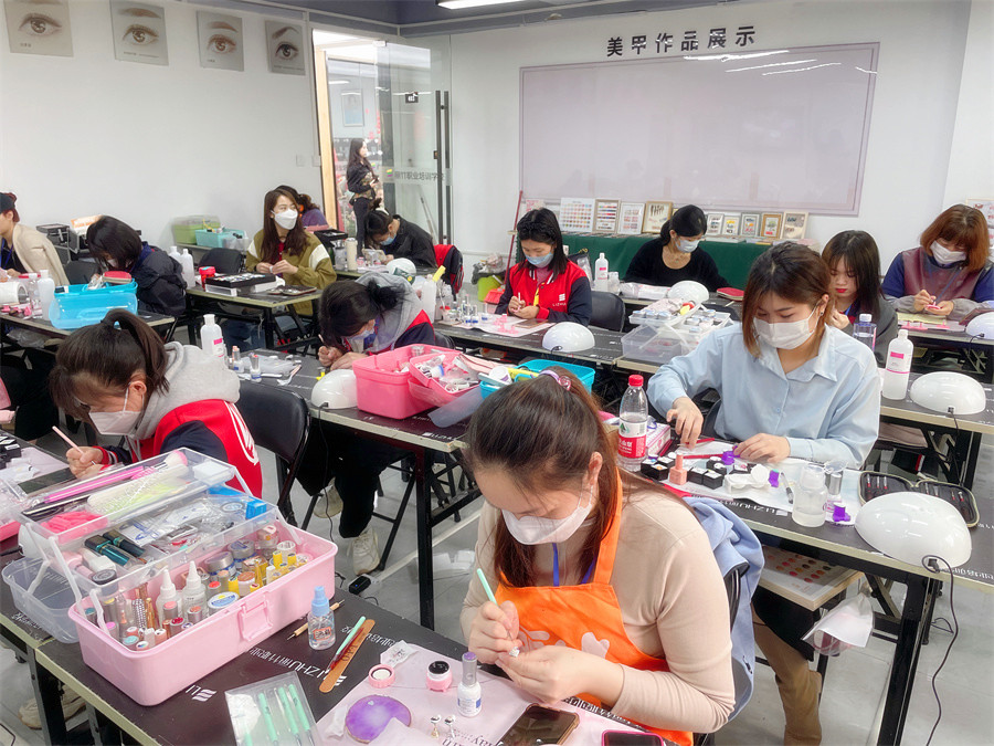 廣西美甲培訓(xùn)班學(xué)員課堂甲面繪制圖案練習(xí)