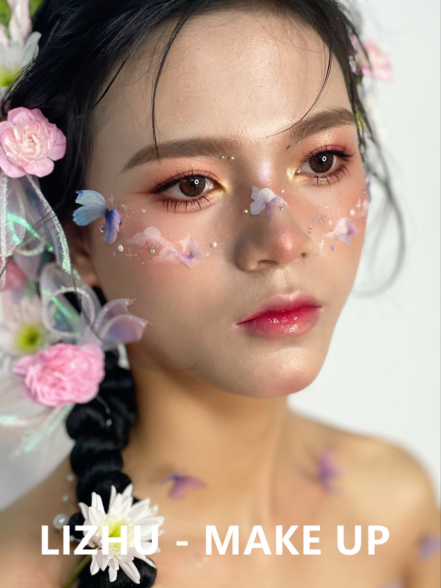 廣西彩妝造型學校作品---哈尼族造型。鮮花滿頭,臉部兩頰被鮮花和用彩繪點綴,呈現(xiàn)出若隱若現(xiàn)宛如世外桃園之感。粉嫩果凍唇妝打造,配以甜蜜少女眼妝,在穿著當?shù)靥厣b,仙氣靈動哈尼族公主造型躍于眼前。
