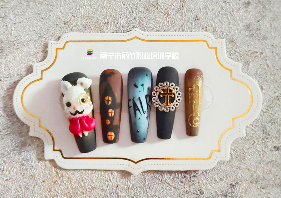 南寧美甲哪家好、南寧美甲分享:作為美甲款式的扛把子之一,雕花美甲因其精湛的技藝,栩栩如生的立體視覺(jué)感受到了無(wú)數(shù)美甲女孩們的青睞。在今天南寧美甲學(xué)校實(shí)訓(xùn)-麗竹美甲課堂上,一起去看看同學(xué)們的制作的雕花卡通美甲吧!