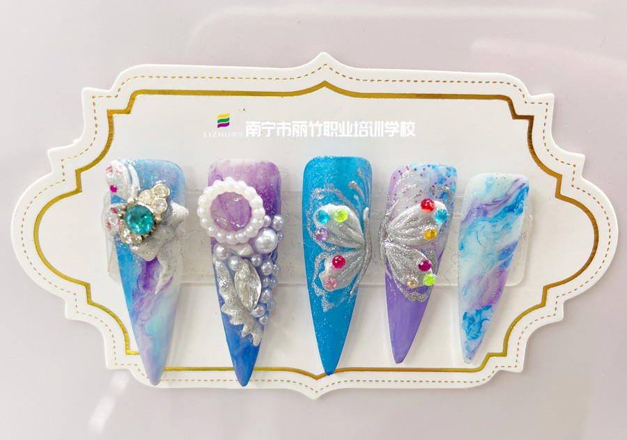 廣西美甲造型培訓、廣西美甲:你有想過,當你把翩翩欲飛的蝴蝶通過美甲技術定格在你的指尖上時,能有多美嗎?廣西美甲款式進修班-麗竹美甲學校的同學們已經完成了自己的作品,和我們一起去看看超火爆的蝴蝶美甲吧!