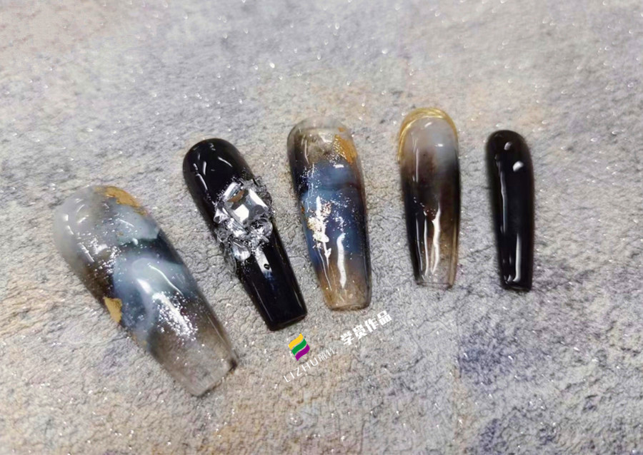 零基礎(chǔ)學(xué)美甲暈染、廣西美甲哪家好:做好大理石暈染美甲的前提,必須要掌握好暈染的步驟。先用甲油膠隨意點(diǎn)色塊案,之后在用暈染筆將色塊暈開,注意顏色過渡自然。圖案暈染好之后,就可以粘貼喜歡的飾品啦。而廣西美甲款式進(jìn)修班(麗竹美甲進(jìn)修班)的同學(xué)們也在課堂上完成了老師布置的作業(yè),一起來看看吧!