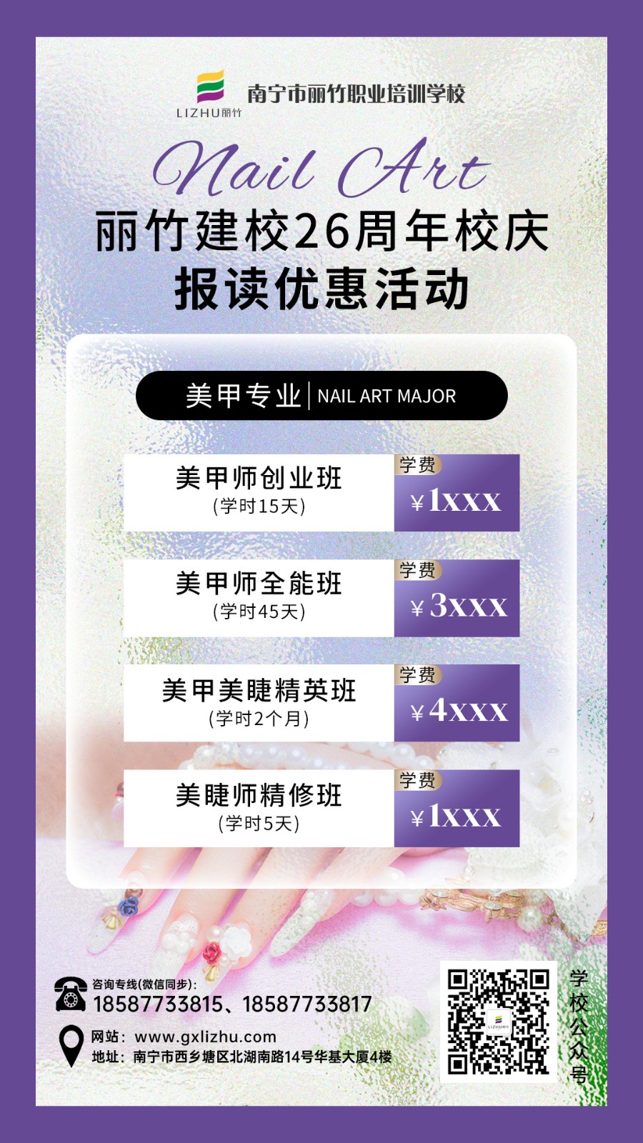 如果你喜愛(ài)美甲,想從事美甲行業(yè)的相關(guān)工作,但是不知道南寧美甲學(xué)校怎么報(bào)名?只要你對(duì)美甲感興趣,有一顆想學(xué)習(xí)的心,那千萬(wàn)不要錯(cuò)過(guò)麗竹學(xué)校正在進(jìn)行的26周年校慶之“報(bào)讀優(yōu)惠活動(dòng)”啦!歡迎關(guān)注麗竹學(xué)校了解更多課程詳情和活動(dòng)信息。