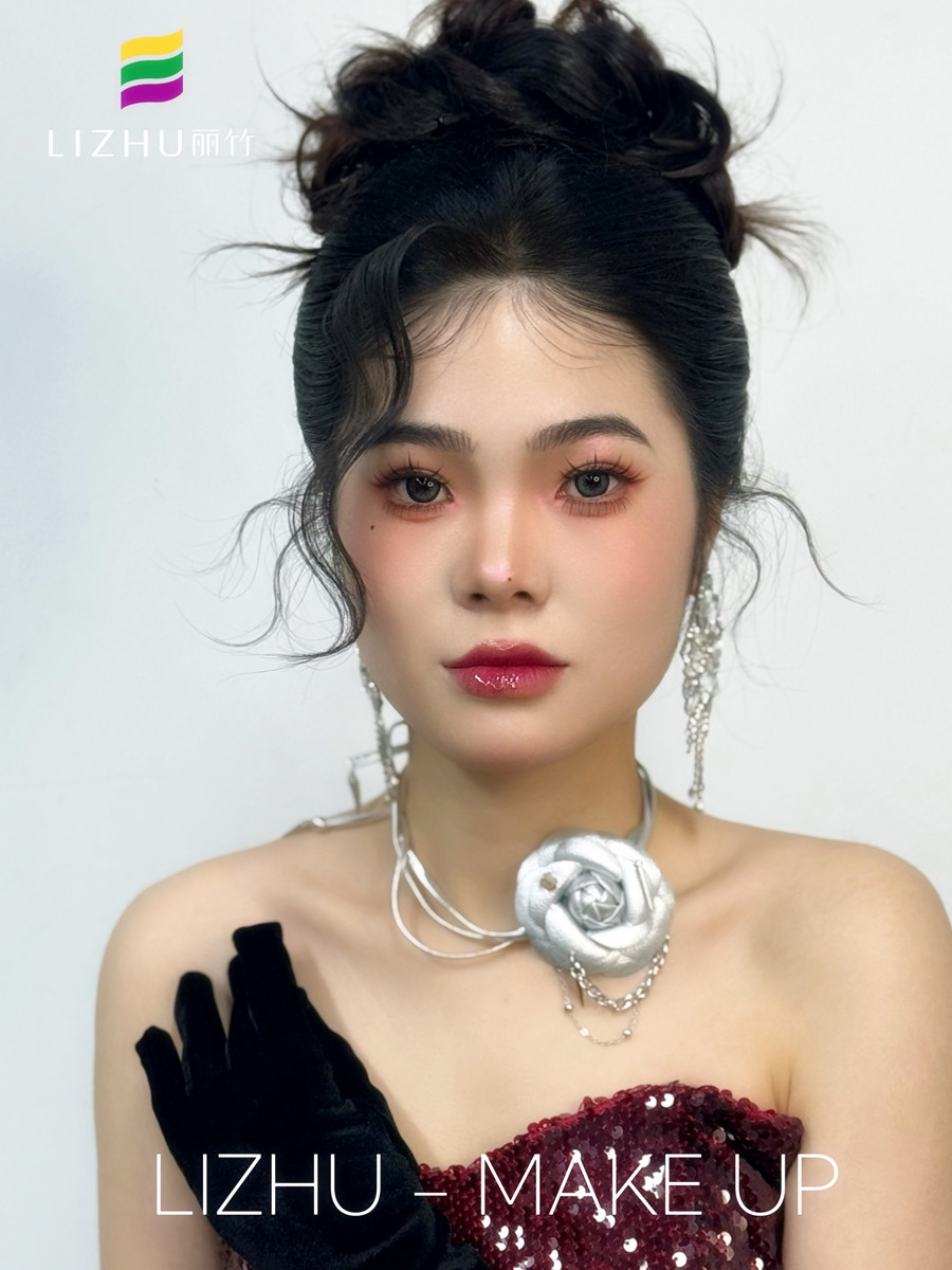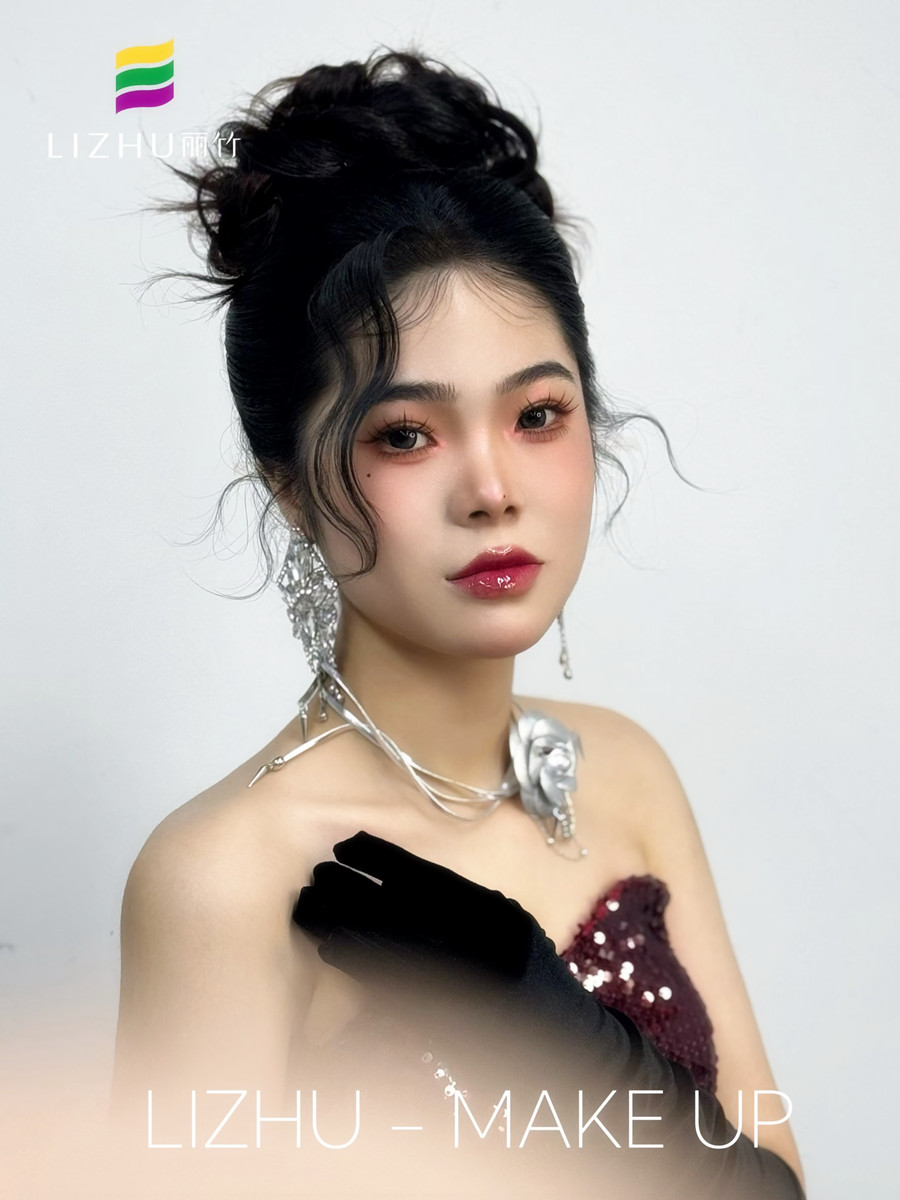 廣西彩妝化妝寫真、廣西化妝高彩、廣西學(xué)彩妝造型影樓(麗竹彩妝化妝學(xué)校)作品---千金禮服造型:極具質(zhì)感的妝容打造,蓬松自然高顱頂盤發(fā),銀色飾品的裝飾點綴,輕松拿捏豪門千金感!
