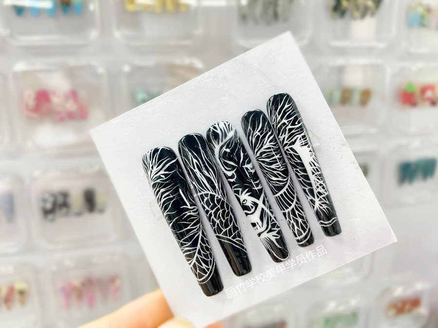 南寧美甲專業(yè)、南寧美甲學(xué)習(xí):美甲技法解析-作品主要以線條繪制的美甲技巧而成。采用中國(guó)傳統(tǒng)的黑白兩色作為主要色彩,以黑色作為大底線,才使用畫(huà)線筆勾畫(huà)出白色龍紋線條。黑白顏色形成的強(qiáng)烈視覺(jué)效果,加上坐著細(xì)膩專業(yè)的繪畫(huà)功底,使得整副作品透露出了濃濃的國(guó)風(fēng)色彩。