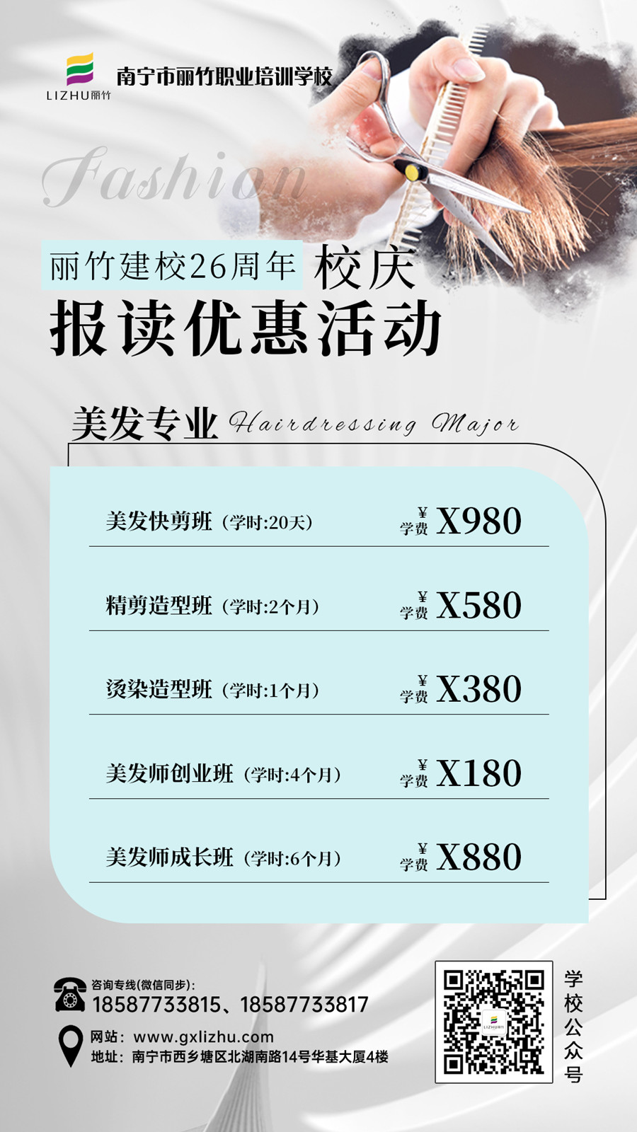 要是你還想獲取更多美發(fā)知識或是南寧美發(fā)資訊,亦或是想知道廣西美發(fā)學校哪家出名?相信廣西美業(yè)人對南寧美業(yè)職業(yè)培訓學校(麗竹學校)一定不會感到陌生?,F(xiàn)在學校正在進行報讀優(yōu)惠活動,想學美發(fā)的小伙伴趕緊報名吧!