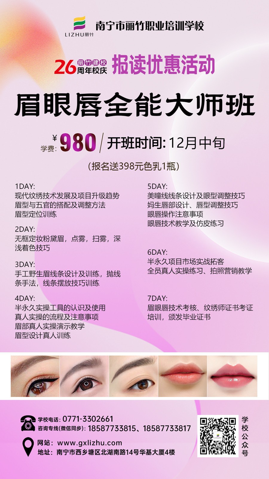 年前給自己一個(gè)快速學(xué)習(xí)一門(mén)技術(shù)的機(jī)會(huì),抓住今年的尾巴,為新一年的到來(lái)開(kāi)個(gè)好頭。南寧紋繡師培訓(xùn)-麗竹學(xué)校12月紋繡全能班(眉眼唇全能大師班)啟動(dòng)開(kāi)班招生中,現(xiàn)在報(bào)名僅需980元,還能額外贈(zèng)送398元色乳1瓶。想在南寧學(xué)紋繡的小伙伴,趕緊聯(lián)系我們報(bào)預(yù)定學(xué)習(xí)名額的吧!