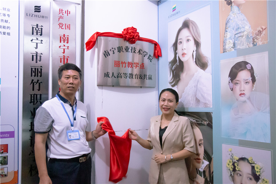 緊接著,在全體師生的共同見(jiàn)證下,王良友校長(zhǎng)和徐穆英校長(zhǎng)為南寧職業(yè)技術(shù)學(xué)院成人高等教育&共贏麗竹教學(xué)點(diǎn)揭牌,現(xiàn)場(chǎng)氣氛高漲,再次響起了熱烈的掌聲和喝彩聲。