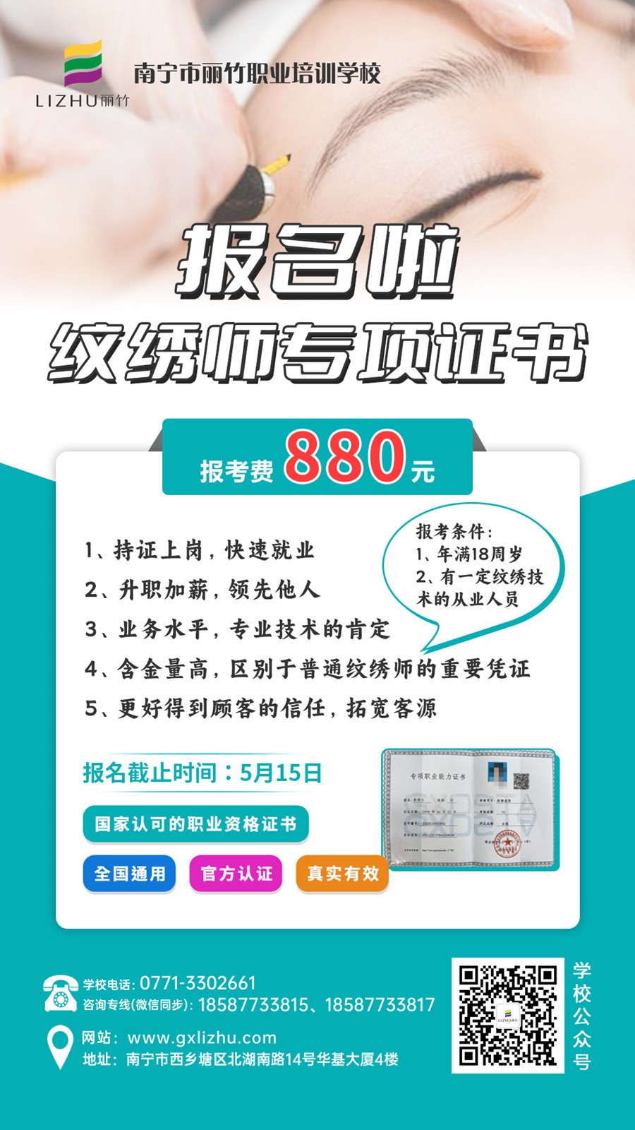 南寧美容師職業(yè)資格證書考試、南寧紋繡師專項(xiàng)證:注意啦!注意啦!在近期有想南寧考美容師證,或是想知道南寧哪里可以考紋繡師證的小伙伴們,南寧美業(yè)職業(yè)培訓(xùn)學(xué)校-麗竹學(xué)??甲C班5月份報(bào)名活動(dòng)正在火熱進(jìn)行中,學(xué)位滿額即截止報(bào)名,所以請(qǐng)務(wù)必好好看看清以下海報(bào)的內(nèi)容信息哦!