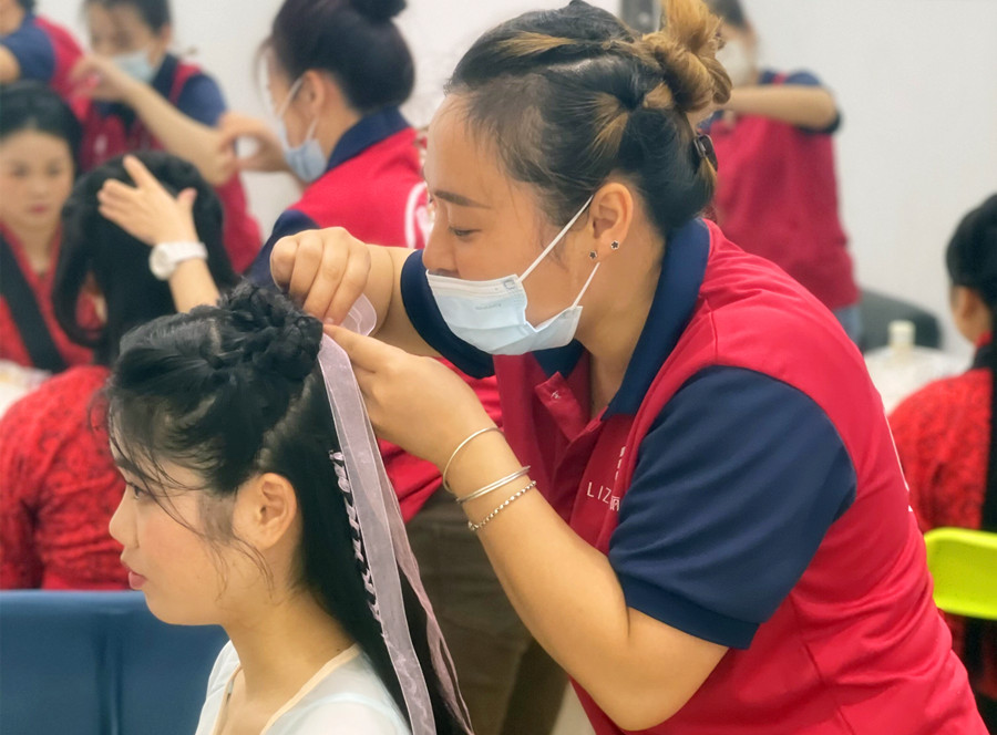 除了妝容的難度,在學(xué)習(xí)發(fā)型課程時(shí),我也覺得困難重重。比如,在做秀禾發(fā)型卷筒的操作時(shí),卷著卷著就突然不知道該如何收尾?又或者是做完后一看,才發(fā)現(xiàn)做出的形狀和老師的不一樣,不僅沒有美觀度,而且還松塌。然后在做赫本包時(shí),倒梳頭發(fā)沒到位,每次倒梳之后捋順赫本包又變小了。披發(fā)兩邊方向燙的不一致……